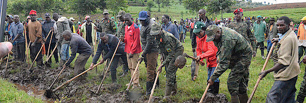 In north, farmers together with RDF soldiers are irrigating crops such as beans, maize, vegetables, soya and irish potatoes on 5,403ha. Thanks to army week, farmers are also expected to plant sweet potatoes on 307ha; vegetables on 522ha; and keep fighting fall armyworms on 2,500ha; soil erosion control on 45ha; and banana rehabilitation on 2,000ha. An estimated 571 cowsheds for Girinka beneficiaries in Burera district will also be renovated.