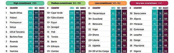 According to the ranking, only 9 African countries are ranked with highly commitment, 9 countries with medium commitment, 11 countries with low commitment, and 16 countries with very low commitment.